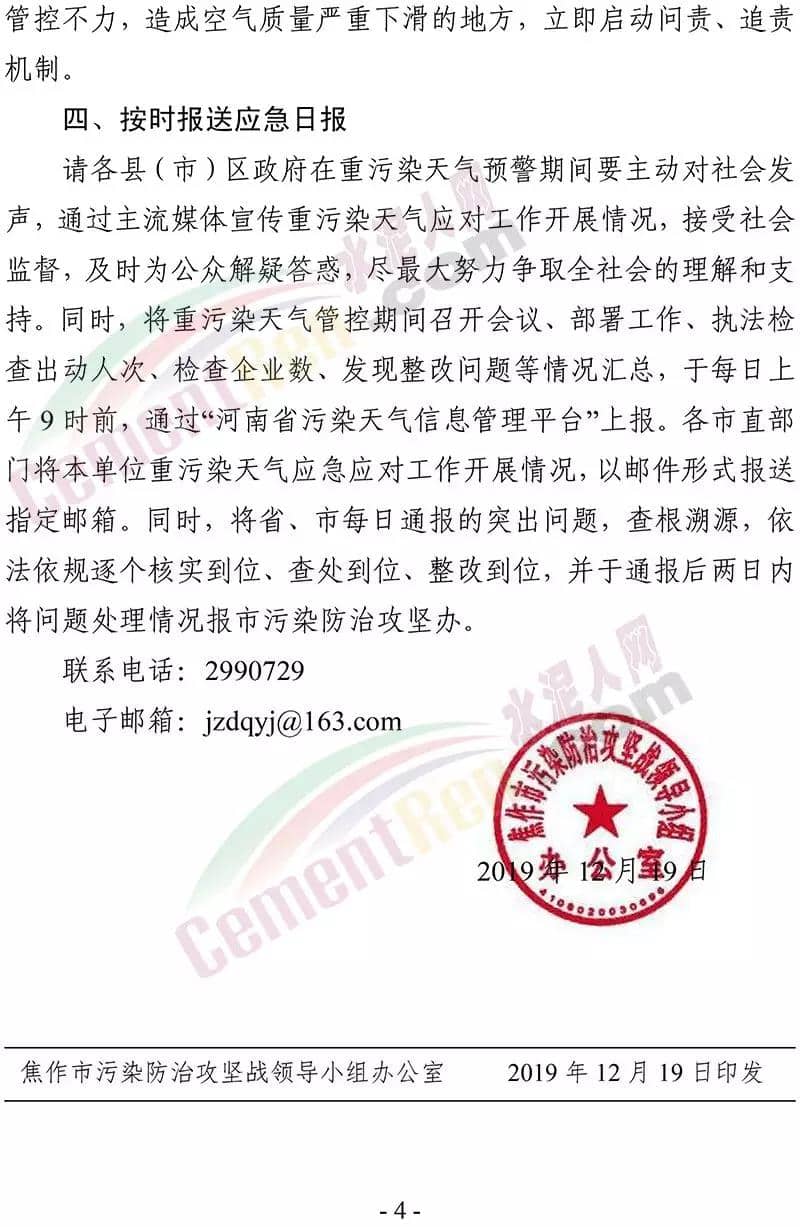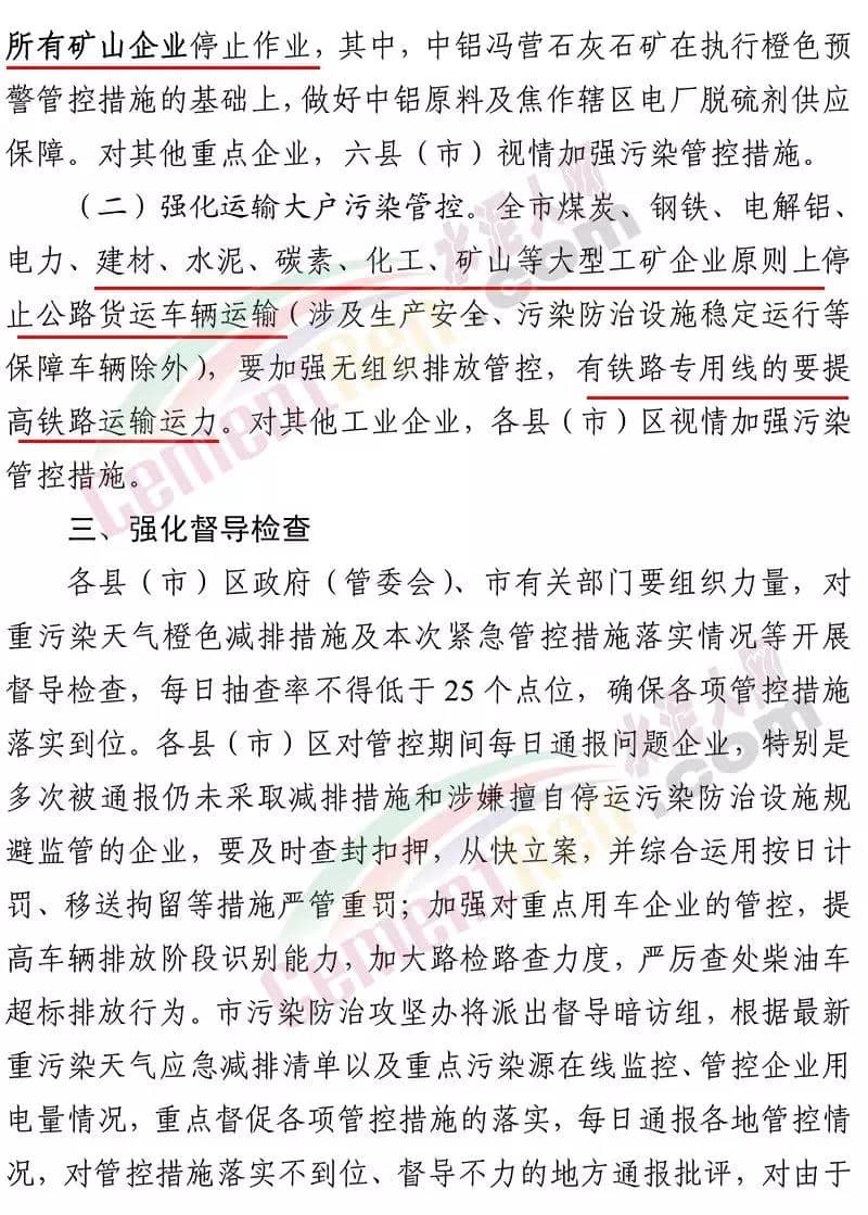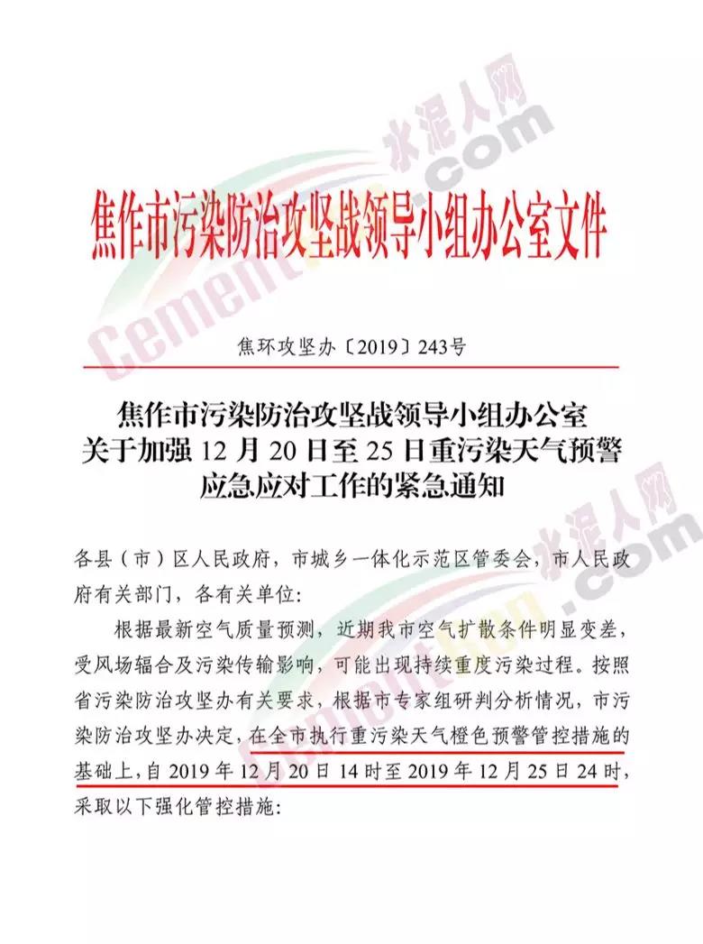 據(jù)了解,12 月 19 日焦作市污染防治攻堅(jiān)戰(zhàn)領(lǐng)導(dǎo)小組辦公室 曾發(fā)布《關(guān)于加強(qiáng) 12 月 20 日至 25 日重污染天氣預(yù)警 應(yīng)急應(yīng)對(duì)工作的緊急通知》要求在全市執(zhí)行重污染天氣橙色預(yù)警管控措施的 基礎(chǔ)上,自 2019 年 12 月 20 日 14 時(shí)至 2019 年 12 月 25 日 24 時(shí), 采取以下強(qiáng)化管控措施強(qiáng)化工地?fù)P塵污染管控。五城區(qū)范圍內(nèi)各類建設(shè)工程(含混凝土攪拌站)要嚴(yán)格落實(shí)重污染天氣紅色預(yù)警管控措施,紅色預(yù)警期間允許作業(yè)的重大民生工程和重點(diǎn)項(xiàng)目,要依法依規(guī)施工作業(yè)。強(qiáng)化污染排放大戶管控。水泥粉磨站(焦作堅(jiān)固水泥有限公司、 焦作千業(yè)水泥有限責(zé)任公司、焦作市中晶水泥有限責(zé)任公司、焦作市賽雪白水泥有限公司、博愛金隅水泥有限公司、沁陽市金隅水泥有限公司、焦作市鵬遠(yuǎn)水泥有限公司、焦作市永石水泥廠、 沁陽市太華建材有限公司、焦作市丹陽水泥有限公司)。全市所有礦山企業(yè)停止作業(yè)。強(qiáng)化運(yùn)輸大戶污染管控。全市煤炭、鋼鐵、電解鋁、 電力、建材、水泥、碳素、化工、礦山等大型工礦企業(yè)原則上停止公路貨運(yùn)車輛運(yùn)輸(涉及生產(chǎn)安全、污染防治設(shè)施穩(wěn)定運(yùn)行等 保障車輛除外),要加強(qiáng)無組織排放管控,有鐵路專用線的要提高鐵路運(yùn)輸運(yùn)力。對(duì)其他工業(yè)企業(yè),各縣(市)區(qū)視情加強(qiáng)污染 管控措施。通知原文如下: