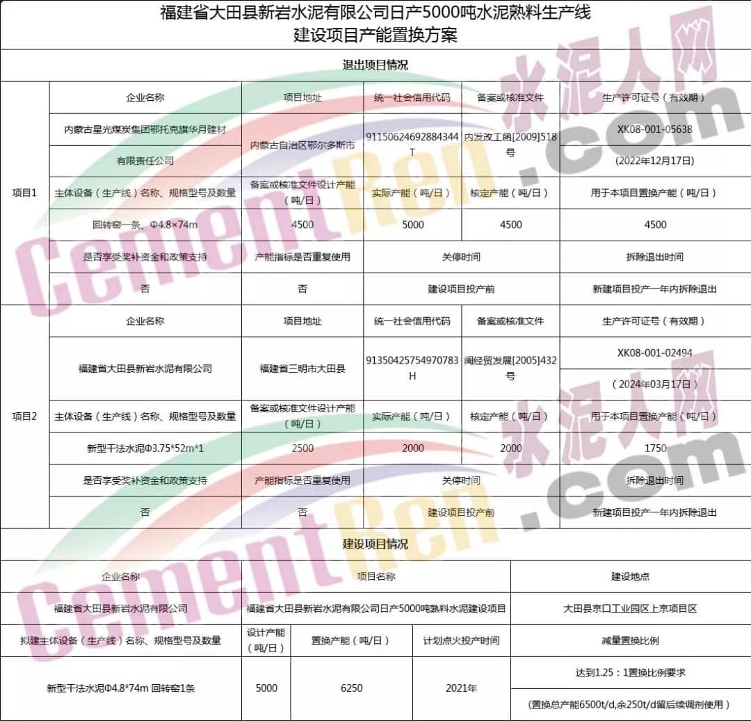 同期,福建省工業(yè)和信息化廳發(fā)布了《關(guān)于福建省大田縣新巖水泥有限公司日產(chǎn)5000噸水泥熟料生產(chǎn)線建設(shè)項目產(chǎn)能置換的公示》,原文如下: