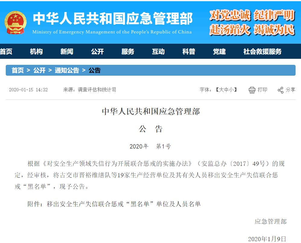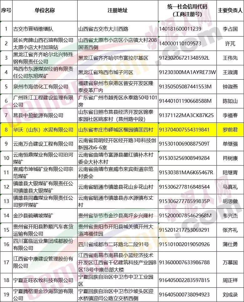 日前國(guó)家應(yīng)急管理部發(fā)布2020年第1號(hào)公告稱,根據(jù)《對(duì)安全生產(chǎn)領(lǐng)域失信行為開展聯(lián)合懲戒的實(shí)施辦法》(安監(jiān)總辦〔2017〕49號(hào))的規(guī)定,經(jīng)審核,將古交市晉裕維繕隊(duì)等19家生產(chǎn)經(jīng)營(yíng)單位及其有關(guān)人員移出安全生產(chǎn)失信聯(lián)合懲戒“黑名單”,并予公告。移出安全生產(chǎn)失信聯(lián)合懲戒“黑名單”的19家生產(chǎn)經(jīng)營(yíng)單位中包括位于山東省棗莊市嶧城區(qū)榴園鎮(zhèn)匡四村華沃(山東)水泥有限公司。