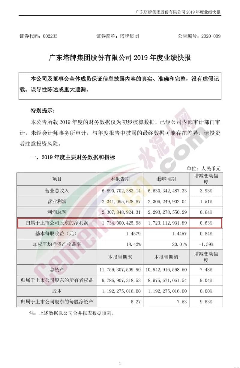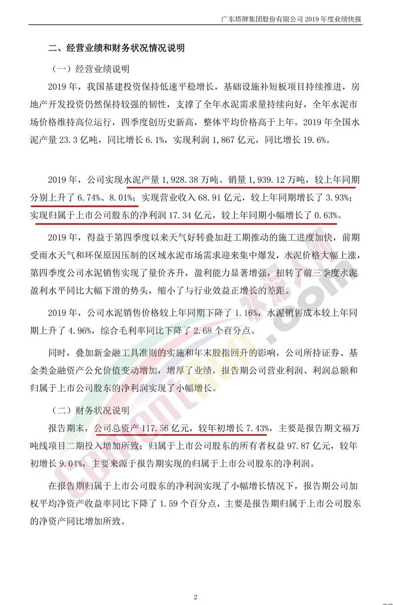 塔牌集團(tuán)(002233)近日發(fā)布2019年年度業(yè)績快報公告,2019年實現(xiàn)營業(yè)收入68.91億元,較上年同期增長了3.93%;實現(xiàn)歸屬于上市公司股東的凈利潤17.34億元,較上年同期小幅增長了0.63%。