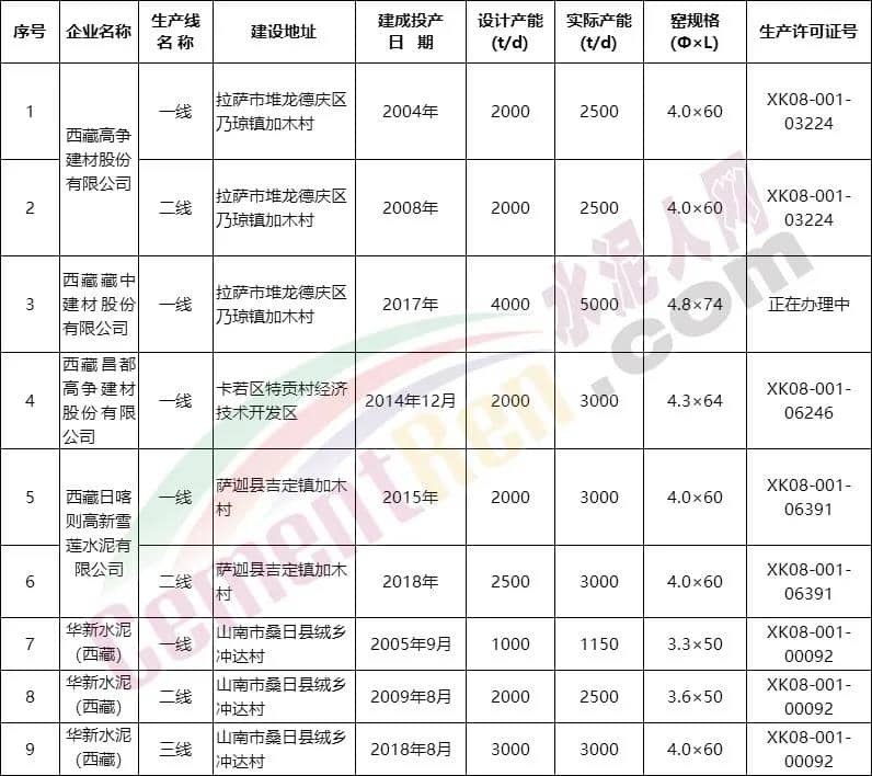 西藏自治區(qū)工信廳2019年未公布的生產(chǎn)清單顯示,截止上年未,西藏自治區(qū)共有9條熟料生產(chǎn)線,設(shè)計(jì)產(chǎn)能約615萬噸/年。