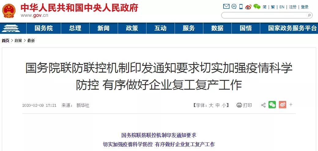 2月8日,國務院應對新型冠狀病毒感染肺炎(以下簡稱“新冠肺炎”)疫情聯(lián)防聯(lián)控機制印發(fā)《關于切實加強疫情科學防控 有序做好企業(yè)復工復產工作的通知》(以下簡稱《通知》)。