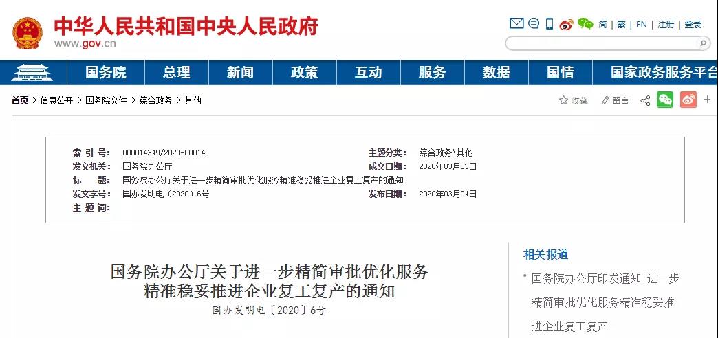 3月3日,國務院辦公廳緊急發(fā)文,《關于進一步精簡審批優(yōu)化服務精準穩(wěn)妥推進企業(yè)復工復產的通知》,要求低風險地區(qū)不得采取審批、備案等方式延緩開工。對于中、高風險兩類地區(qū),各省(自治區(qū)、直轄市)政府要在滿足疫情防控要求的基礎上,按照最少、必需原則分別制定公布全省統(tǒng)一的復工復產條件,對確有必要的審批和證明事項實行清單管理,逐項列明辦理程序、材料和時限,清單之外一律不得實施審批或索要證明,防止出現(xiàn)層層加碼、互為前置審批、循環(huán)證明等現(xiàn)象。嚴禁向企業(yè)收取復工復產保證金等。對重點行業(yè)企業(yè)復工復產可設置審批綠色通道,加快提高復工復產率。