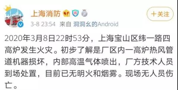 據(jù)上海消防通報(bào),2020年3月8日22時(shí)53分,上海寶山區(qū)緯一路四高爐發(fā)生火災(zāi)。初步了解是廠區(qū)內(nèi)一高爐熱風(fēng)管道機(jī)器損壞,內(nèi)部高溫氣體噴出,廠方技術(shù)人員到場(chǎng)處置,目前已無(wú)明火和煙霧?,F(xiàn)場(chǎng)無(wú)人員傷亡。