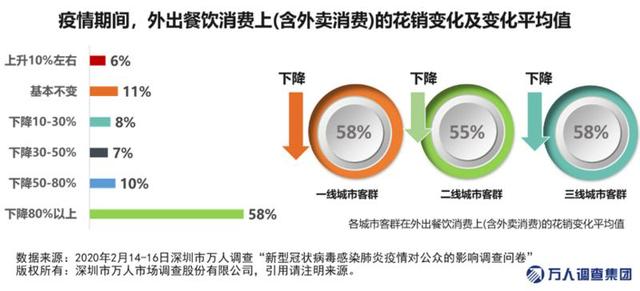 數(shù)據(jù)顯示,近六成市民表示疫情期間外出餐飲支出下降超過80%。整體來看,一二三線城市的市民在餐飲(含外賣)花銷的降幅較為一致,平均下降比例均在55%-58%之間。