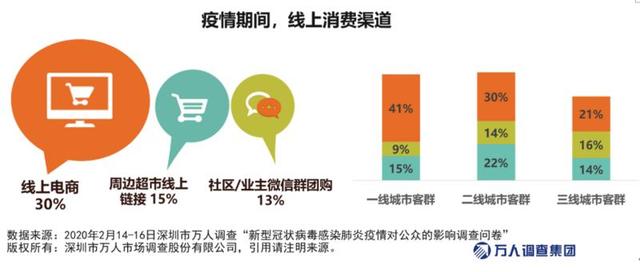 通過調查發(fā)現(xiàn),線上電商在不同年齡層消費者中的影響已經(jīng)顯現(xiàn),全民“下單”熱。線上電商(叮咚買菜、每日優(yōu)鮮、盒馬、美團等)的消費熱度:一線遠遠好于二三線城市。一線城市選擇線上電商消費的比例為41%,二線城市為30%,三線城市為21%。值得一提的是,社區(qū)/業(yè)主微信群團購業(yè)務在三線城市的表現(xiàn)(16.3%)遠好于一二線城市(8.6%),說明社群經(jīng)濟已在三線城市不斷下沉。