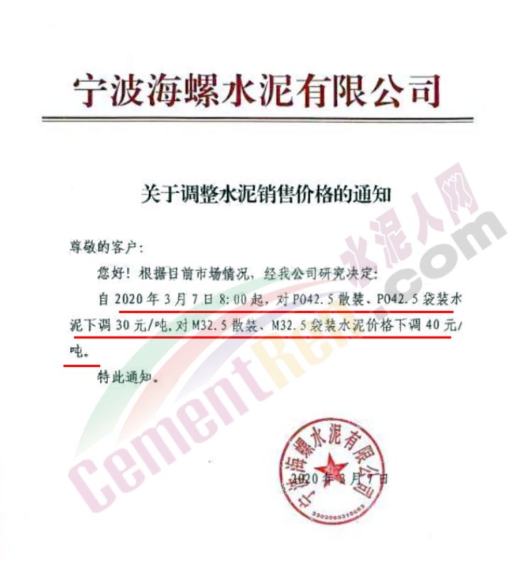 3月7日,寧波海螺水泥有限公司通知,PO42.5散裝、PO42.5袋裝水泥下調(diào)30元/噸,M32.5散裝、M32.5袋裝水泥價(jià)格下調(diào)40元/噸。