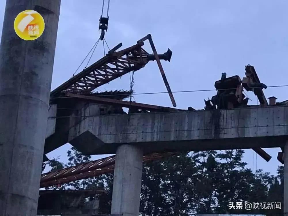 14時(shí)25分,架橋機(jī)吊掛1號(hào)梁橫移至2跨左幅1號(hào)位準(zhǔn)備下降就位時(shí),伴隨著“咔嚓”響聲,架橋機(jī)左前支腿鋼筒支撐銷軸突然脫落,左支撐鋼筒回縮下沉,1號(hào)箱梁以箱梁幾何重心為中心逆時(shí)針旋轉(zhuǎn),架橋機(jī)向右側(cè)甩尾,帶動(dòng)架橋機(jī)右主梁桁架連同右前支腿前沖約5m脫離2號(hào)橋墩蓋梁懸空墜落,左支撐鋼筒斷裂向右后方傾倒,架橋機(jī)瞬間傾覆解體。因主梁的旋轉(zhuǎn)使吊載的1號(hào)梁后部與已就位的3號(hào)梁刮擦纏繞,1號(hào)梁將3號(hào)梁拽出橋墩蓋梁一同墜落橋下在建的陽(yáng)安鐵路二線軌道上。解體后向右滾轉(zhuǎn)傾翻的架橋機(jī)右主梁桁架前端將王俊霞、譚華軍、崔高賢、姚笛、付永平、董炳紅、季輝、王海濤、肖文9人砸中壓在橋面上,齊辰鵬、胡長(zhǎng)安、李航博3人在閃避中不同程度軟組織擦傷。
