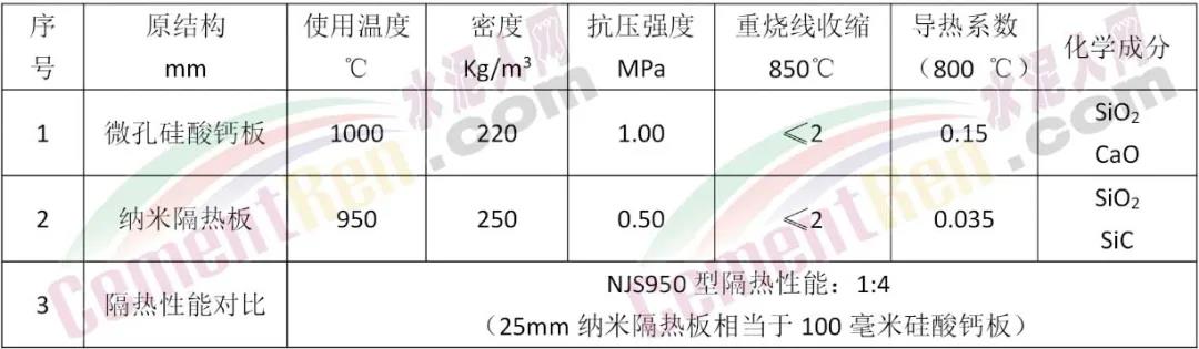 4~5級下料管使用微晶高溫耐磨材料同時,采用新型的NJS950型納米隔熱材料為背襯隔熱層,彌補(bǔ)了微晶材料和耐火澆注料的隔熱性能不足的問題。NJS950型納米隔熱材料是采用納米技術(shù),添加了獨特的反紅外輻射材料,采取特殊的工藝生產(chǎn)出來的納米級微孔隔熱材料,相比較于傳統(tǒng)陶瓷纖維和微孔硅酸鈣板這類微米級氣孔隔熱材料,納米隔熱材料的氣孔在20納米左右,導(dǎo)致其導(dǎo)熱系數(shù)成為迄今為止最低的隔熱材料,同樣溫度下的隔熱性能比傳統(tǒng)隔熱材料要好4倍,詳細(xì)隔熱性能對比見下表-1。