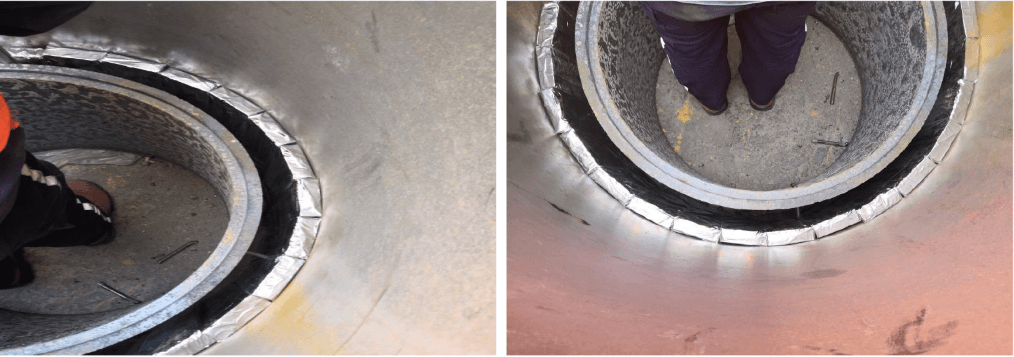 拆除4~5級舊下料管,重新制作直徑D950mm鐵質(zhì)外筒,內(nèi)部安裝內(nèi)徑為Φ700mm微晶高溫耐磨筒,在外筒內(nèi)壁上焊接V80扒釘,然后在內(nèi)壁的錨固件之間鑲貼30mm的NJS950型納米隔熱板,填充澆注料,在合適部位預(yù)留清灰孔。施工中要求上下的每節(jié)微晶高溫耐磨筒必須卡入自身的端頭卡槽內(nèi),接縫處無爬臺現(xiàn)象;確保納米隔熱板鑲貼嚴(yán)密、澆注料厚度均勻。4~5級下料管總長度為48m,總的使用面積為143m2,詳細(xì)施工見下圖-1和圖-2。
