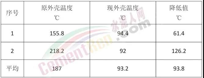 新型的4~5下料管投入使用后,在正常生產(chǎn)運行中,用專門的紅外線成像測溫儀器,對更換的部位進(jìn)行測溫,溫度改善效果詳細(xì)見下表-2。