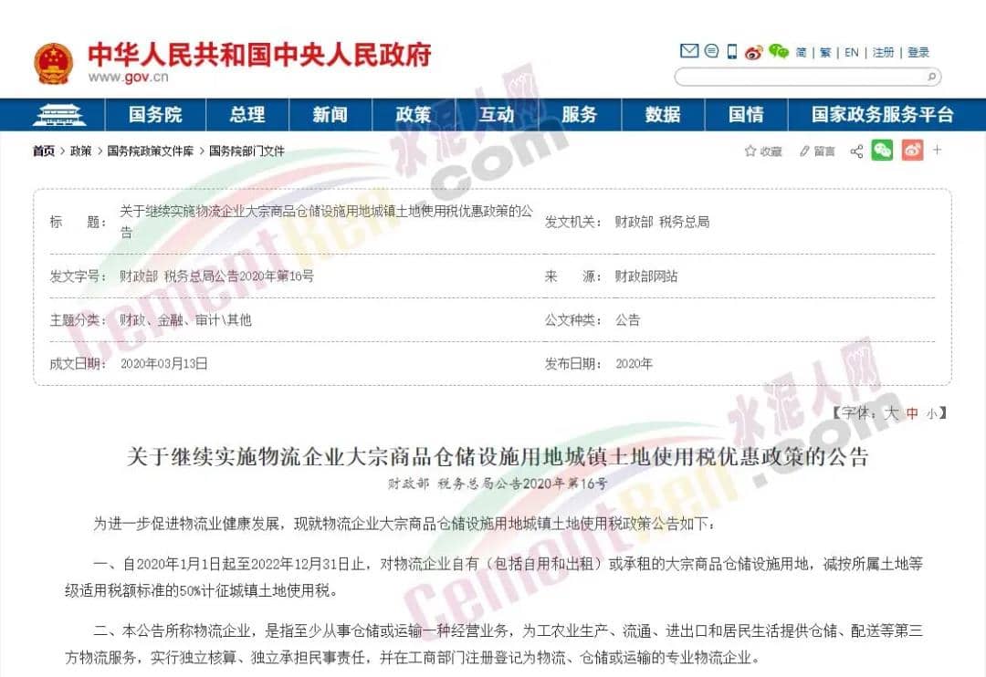 公告稱,自2020年1月1日起至2022年12月31日止,對物流企業(yè)自有(包括自用和出租)或承租的大宗商品倉儲設(shè)施用地,減按所屬土地等級適用稅額標(biāo)準(zhǔn)的50%計征城鎮(zhèn)土地使用稅。