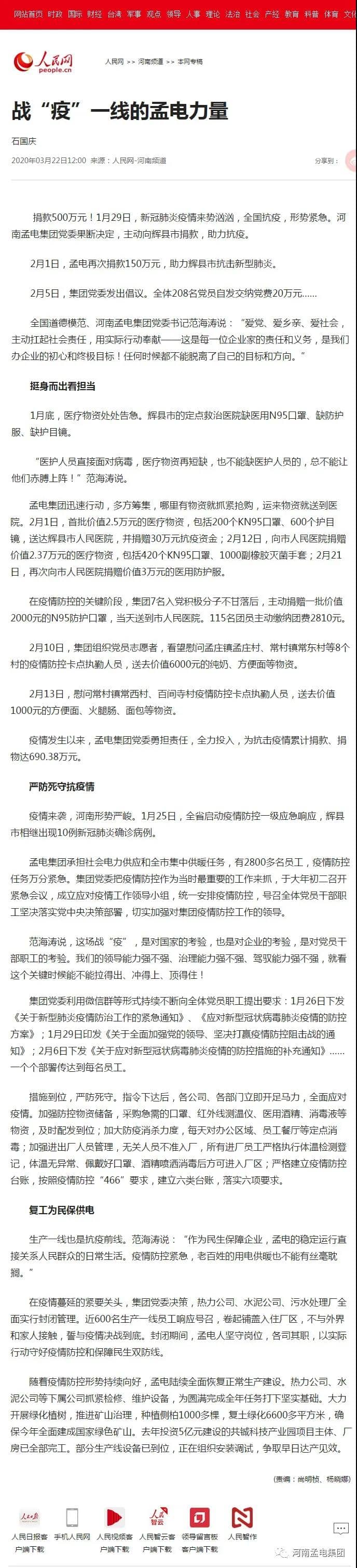 (3月22日,人民網(wǎng)記者撰文對孟電集團(tuán)面對疫情、主動作為的事跡進(jìn)行了報道。)