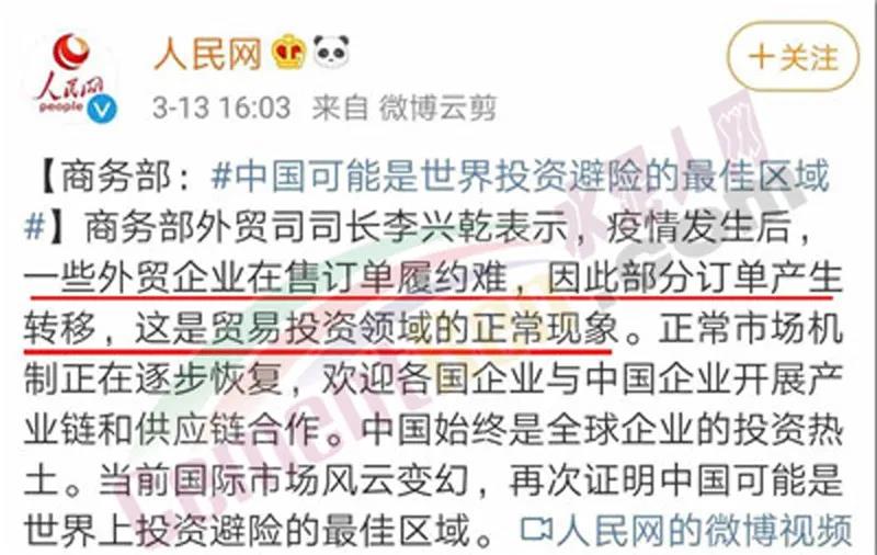 其實,早在中國疫情最嚴重的時候,由于外貿(mào)企業(yè)停工,無法按期交付訂單,已經(jīng)導(dǎo)致部分訂單轉(zhuǎn)移到了其它國家。國家商務(wù)部門也注意到這個問題,并表示這是正常的現(xiàn)象。