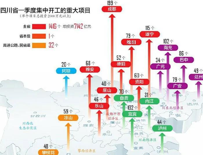 2、促進五區(qū)協(xié)同發(fā)展,強化路網(wǎng)互聯(lián)互通,如天府新區(qū)至邛崍、古藺至金沙等2個高速公路(81公里、195億元)、S204線通江縣城至諾水河等21個國省干線(241公里、92億元);