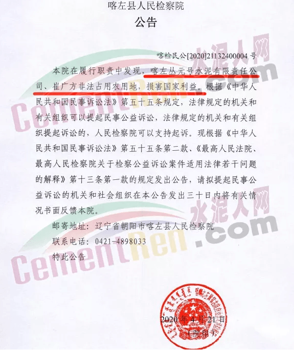 據(jù)水泥人網(wǎng)了解,4月21日,遼寧省朝陽市喀左縣人民檢察院在履行職責(zé)中發(fā)現(xiàn),喀左叢元號水泥有限責(zé)任公司、崔廣方非法占用農(nóng)用地,損害國家利益。根據(jù)《中華人民共和國民事訴訟法》第五十五條規(guī)定,法律規(guī)定的機關(guān)和有關(guān)組織可以提起民事公益訴訟,法律規(guī)定的機關(guān)和有關(guān)組織提起訴訟的,人民檢察院可以支持起訴。
