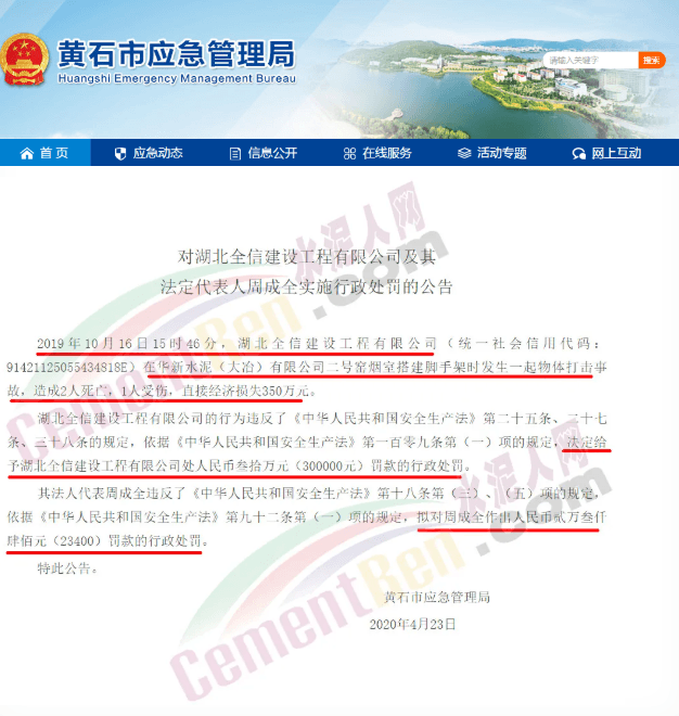 事故相關(guān)企業(yè)華新水泥(大冶)有限公司、湖北全信建設(shè)工程有限公司的行為違反了《中華人民共和國安全生產(chǎn)法》相關(guān)條款規(guī)定對上述公司及主要負(fù)責(zé)人總經(jīng)理、法人做出相應(yīng)的處罰。
