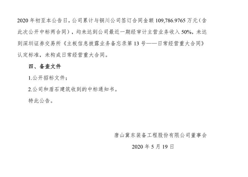 冀東裝備公布,日前公司及公司全資子公司唐山盾石建筑工程有限責(zé)任公司(“盾石建筑”)分別與冀東水泥銅川有限公司簽訂通過(guò)公開招標(biāo)方式中標(biāo)的項(xiàng)目“冀東水泥銅川有限公司惠塬工業(yè)園10000t/d熟料水泥生產(chǎn)線設(shè)備成套采購(gòu)項(xiàng)目”《設(shè)備成套及采購(gòu)總承包合同》和“冀東水泥銅川有限公司惠塬工業(yè)區(qū)10000t/d熟料水泥生產(chǎn)線工程一標(biāo)段”《建設(shè)工程施工合同》,上述兩合同合計(jì)金額10.81億元,為向關(guān)聯(lián)方銷售合同。上述兩項(xiàng)目合同預(yù)計(jì)在2021年履約完畢,其中在2020年預(yù)計(jì)形成的收入已納入公司2020年日常關(guān)聯(lián)交易預(yù)計(jì)。