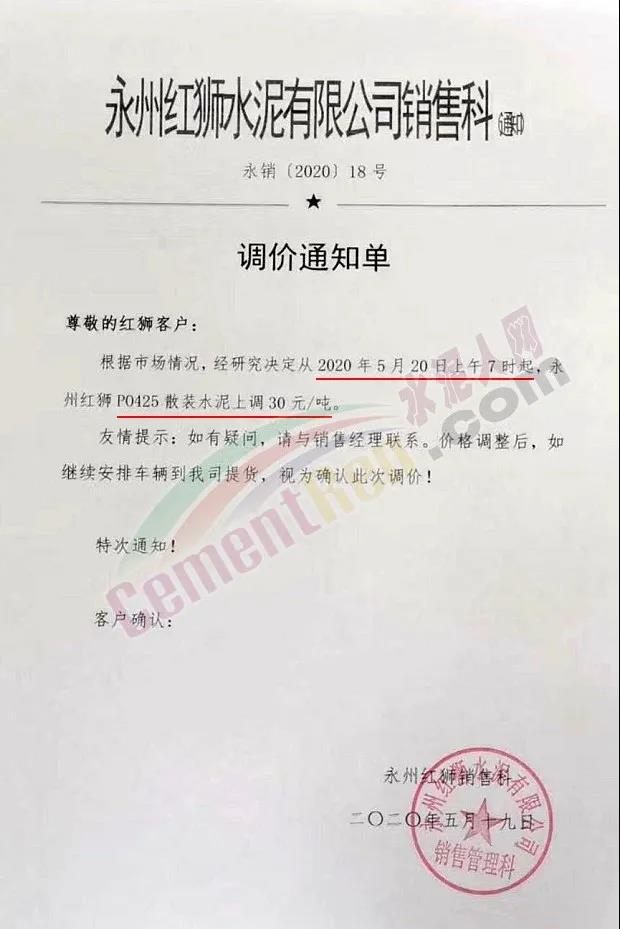 19日,永州紅獅水泥有限公司銷售科通知,從5月20日上午7時(shí)起PO42.5散裝水泥上調(diào)30元/噸。