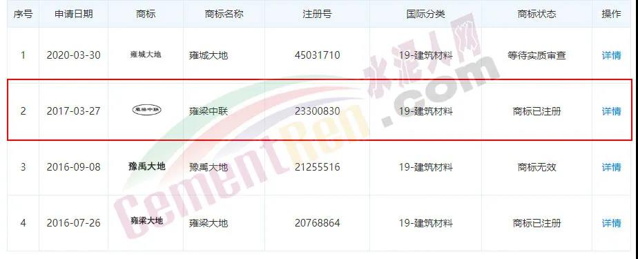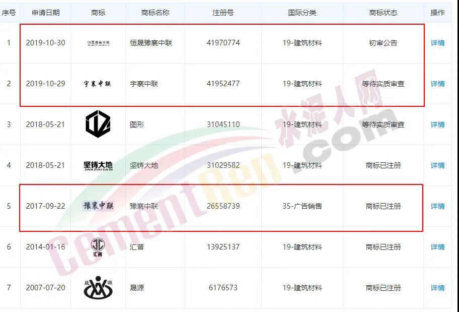 許昌市恒晟水泥有限公司 :“豫襄中聯(lián)”商標(biāo)已注冊; “宇襄中聯(lián)” 等待實質(zhì)審查;“恒晟豫襄中聯(lián)” 初審公告