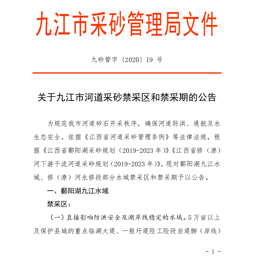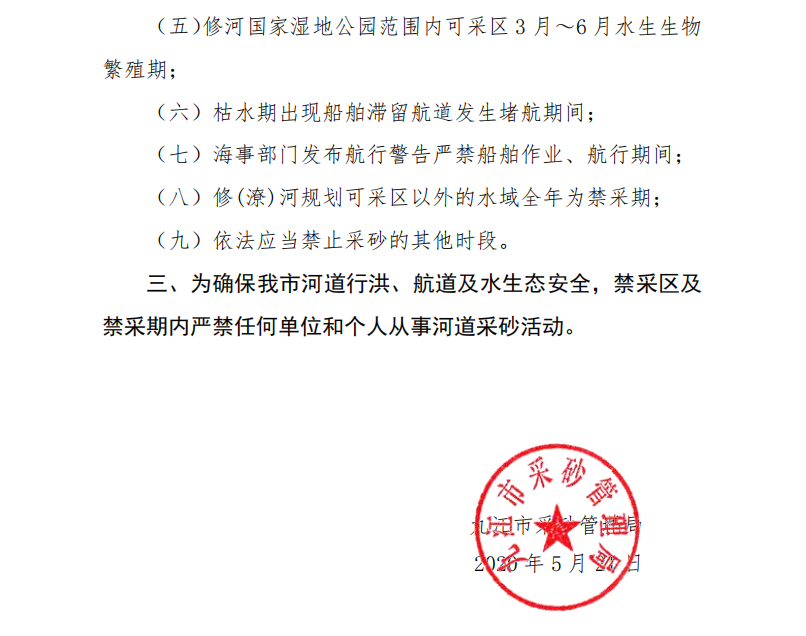 5月21日,九江市采砂管理局公布了該市河道采砂禁采區(qū)和禁采期。其中,鄱陽湖規(guī)劃采砂的九江水域3月1日至6月30日為禁采期。