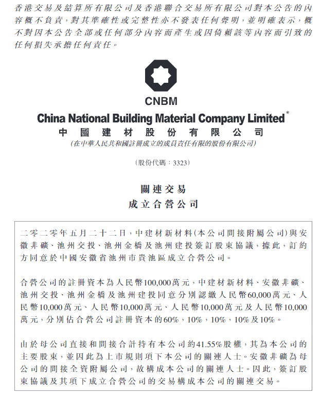 中國(guó)建材(03323)發(fā)布公告,2020年5月22日,該公司間接附屬公司中建材新材料與安徽非礦、池州交投、池州金橋及池州建投簽訂股東協(xié)議,訂約方同意于中國(guó)安徽省池州市貴池區(qū)成立合營(yíng)公司。