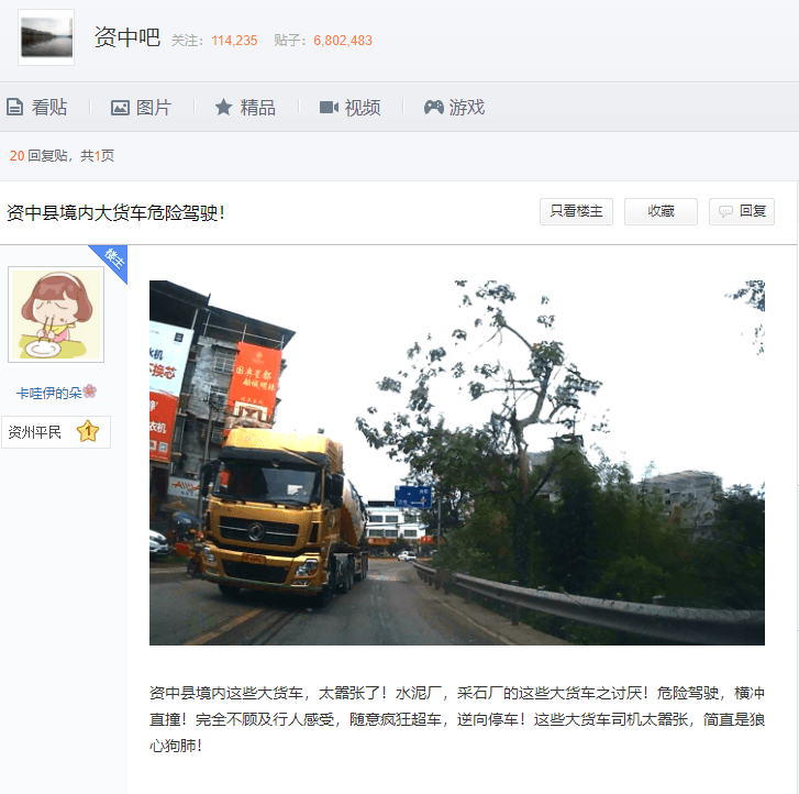 百度“資中吧”中一網(wǎng)友表示“資中縣境內(nèi)這些大貨車(chē),太囂張了!水泥廠,采石廠的這些大貨車(chē)之討厭!危險(xiǎn)駕駛,橫沖直撞!完全不顧及行人感受,隨意瘋狂超車(chē),逆向停車(chē)!這些大貨車(chē)司機(jī)太囂張,簡(jiǎn)直是狼心狗肺!”