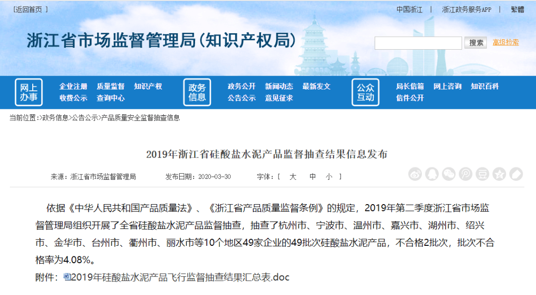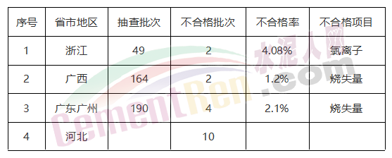 浙江省浙江省市場(chǎng)監(jiān)管局2019年硅酸鹽水泥產(chǎn)品監(jiān)督抽查結(jié)果顯示10個(gè)地區(qū)的49個(gè)批次產(chǎn)品中不合格2批次,不合格項(xiàng)目為氯離子。