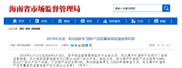 海南省市場(chǎng)監(jiān)督管理局公布2019年水泥、?;郀t礦渣粉產(chǎn)品質(zhì)量省級(jí)監(jiān)督抽查結(jié)果顯示,共抽查涉及17家企業(yè)20個(gè)批次產(chǎn)品,抽檢水泥、?;郀t礦渣粉產(chǎn)品合格率為90%,檢出2個(gè)批次產(chǎn)品不合格,不合格產(chǎn)品檢出率10%。