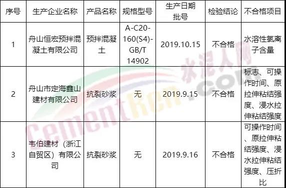 2020年1月,浙江省舟山市市場(chǎng)監(jiān)督管理局網(wǎng)站公布2019年四季度市級(jí)產(chǎn)品質(zhì)量監(jiān)督抽查結(jié)果,共抽查了全市8家企業(yè)生產(chǎn)的預(yù)拌混凝土、抗裂砂漿等3種8批次產(chǎn)品,其中合格5批次,不合格3批次,批次合格率為62.5%。