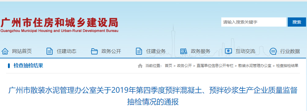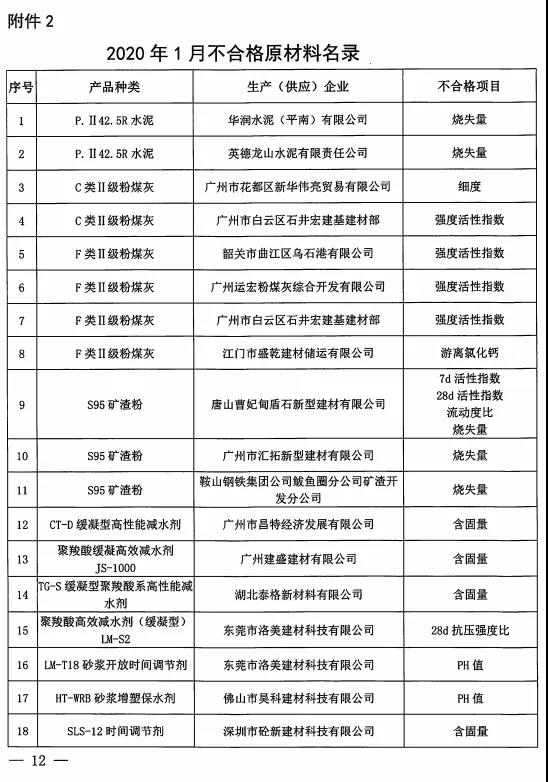 廣州市散裝水泥管理辦公室發(fā)布《關(guān)于2019年第四季度預(yù)拌混凝土、預(yù)拌砂漿生產(chǎn)企業(yè)質(zhì)量監(jiān)督抽檢情況的通報(bào)》,共抽檢水泥190份,不合格4份。其中不合格水泥涉及兩家企業(yè),分別為華潤(rùn)水泥(平南)有限公司、英德龍山水泥有限責(zé)任公司,不合格項(xiàng)目均為燒失量。