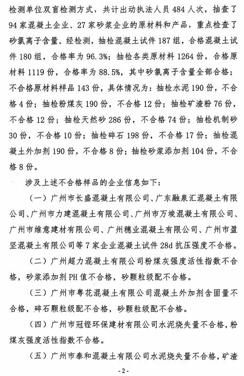 對(duì)上上述監(jiān)督抽檢不合格的企業(yè)列為重點(diǎn)檢查對(duì)象,廣州市散辦將加大監(jiān)管力度,重點(diǎn)核查上述企業(yè)質(zhì)量管理情況,并不定期開(kāi)展質(zhì)量抽檢 。將本次抽檢的不合格原材料列入不合格原材料名錄,建議全市預(yù)拌混凝土企業(yè),預(yù)拌砂漿企業(yè)謹(jǐn)慎選用名錄內(nèi)的原材料。