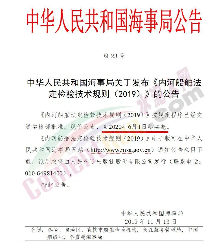 2019年11月20日,交通運(yùn)輸部海事局發(fā)布了《內(nèi)河船舶法定檢驗(yàn)技術(shù)規(guī)則(2019)》。規(guī)則針對(duì)我國(guó)內(nèi)河船長(zhǎng)大于等于20米船舶設(shè)計(jì)建造、營(yíng)運(yùn)檢驗(yàn)的技術(shù)法規(guī)進(jìn)行了系統(tǒng)明確,同時(shí)對(duì)內(nèi)河船舶檢驗(yàn)制度、安全與防污染技術(shù)要求等方面進(jìn)行了全面、系統(tǒng)修訂。有關(guān)負(fù)責(zé)人表示,規(guī)則的發(fā)布實(shí)施將對(duì)我國(guó)內(nèi)河船舶航行安全以及環(huán)境保護(hù)起到積極促進(jìn)作用。該規(guī)則將于2020年6月1日起正式實(shí)施。