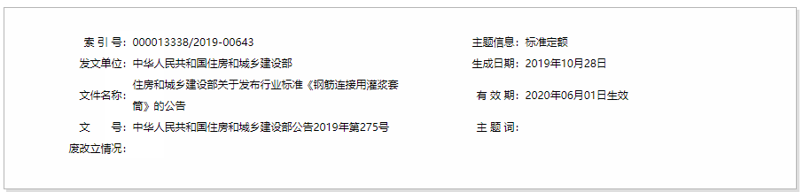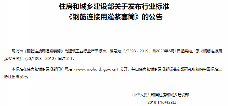 還有一件大事要關(guān)注:那就是住房和城鄉(xiāng)建設(shè)部發(fā)布了關(guān)于《鋼筋連接用灌漿套筒》的公告,批準(zhǔn)由中國(guó)建筑科學(xué)研究院主編的《鋼筋連接用套筒灌漿料》為建筑工業(yè)行業(yè)產(chǎn)品標(biāo)準(zhǔn),編號(hào)為JG/T408-2019,自2020年6月1日起實(shí)施。