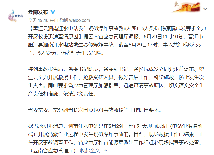 據(jù)云南省應(yīng)急管理廳通報,5月29日11時10分,普洱市墨江縣泗南江水電站發(fā)生疑似爆炸事故。截至5月29日17時,事故共造成6人死亡、5人受傷,傷者暫無生命危險。