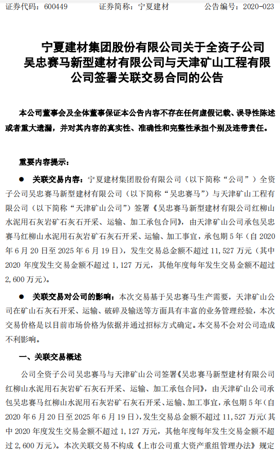 昨日(6月1日)寧夏建材(600449.SH)公布,公司全資子公司吳忠賽馬與天津礦山工程有限公司(以下簡稱“天津礦山公司”)簽署《吳忠賽馬新型建材有限公司紅柳山水泥用石灰?guī)r礦石灰石開采、運輸、加工承包合同》,由天津礦山公司承包吳忠賽馬紅柳山水泥用石灰?guī)r礦石灰石開采、運輸、加工事宜,承包期5年(自2020年6月20日至2025年6月19日),發(fā)生交易總金額不超過1.15億元(其中2020年度發(fā)生交易金額不超過1127萬元,其他年度每年發(fā)生交易金額不超過2600萬元)。