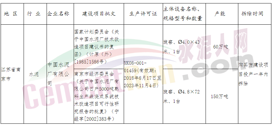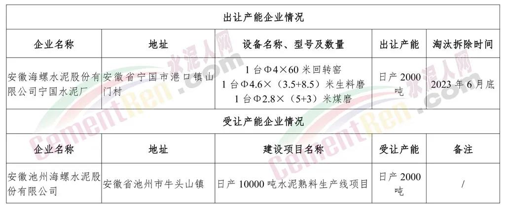 產(chǎn)能出讓情況表顯示,位于安徽省寧國市港口鎮(zhèn)山門村的安徽海螺水泥股份有限公司寧國水泥廠將出讓2000t/d熟料生產(chǎn)線(于2023年6月底前淘汰拆除)給位于安徽省池州市牛頭山鎮(zhèn)的池州海螺水泥新建日產(chǎn)10000噸水泥熟料生產(chǎn)線,受讓產(chǎn)能為2000t/d。同期有消息稱,前期江蘇省公示的中國水泥廠退出產(chǎn)能也將用于新建池州海螺水泥萬噸線項目。6月1日,江蘇省工信廳發(fā)布《關(guān)于中國水泥廠有限公司產(chǎn)能確認的公告》將中國水泥廠共210萬噸/年產(chǎn)能置換出讓。