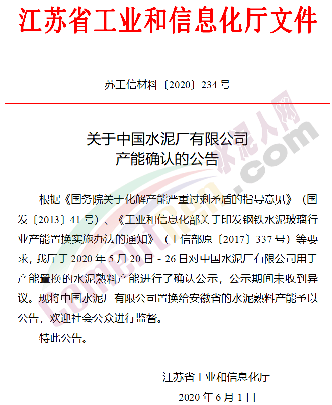 6月2日宣城市人民政策發(fā)布《關(guān)于安徽海螺水泥股份有限公司寧國水泥廠日產(chǎn)2000噸水泥孰料生產(chǎn)線產(chǎn)能出讓的公告》稱,根據(jù)《國務院關(guān)于化解產(chǎn)能嚴重過剩矛盾的指導意見》(國發(fā)〔2013〕41號)和《工業(yè)和信息化部關(guān)于印發(fā)鋼鐵水泥玻璃行業(yè)產(chǎn)能置換實施辦法的通知》(工信部原〔2017〕337號)等文件要求,現(xiàn)將安徽海螺水泥股份有限公司寧國水泥廠2000噸/日水泥孰料生產(chǎn)線產(chǎn)能跨市出讓情況予以公告,歡迎社會公眾進行監(jiān)督,公告期:2020年6月2日- 6月8日。