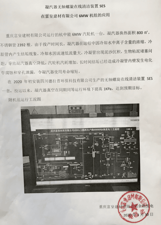 實(shí)事證明,富皇建材當(dāng)初的選擇是沒有問題的,無(wú)軸螺旋在線清潔裝置SES投運(yùn)4年以來,凝汽器真空在同期同等運(yùn)行環(huán)境下提升1kpa,達(dá)到預(yù)期目標(biāo),為富皇建材增加200度發(fā)電量,不僅徹底解決了化學(xué)腐蝕和穿孔泄漏的問題,而且還為富皇建材創(chuàng)造了更大的收益,可謂是一舉多得,富皇建材對(duì)于四川德拉普研發(fā)的無(wú)軸螺旋在線清潔裝置SES給予了高度的認(rèn)可和肯定,同時(shí)也希望四川德拉普能夠?qū)⑦@一福利帶給更多的水泥企業(yè)。