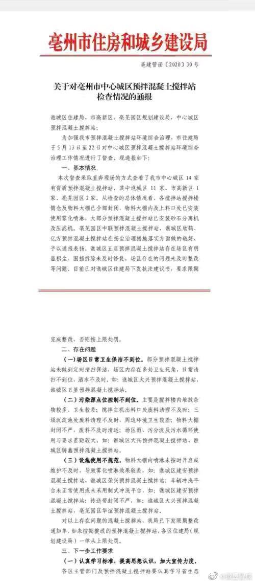 2020年5月22日,亳州市住建局經(jīng)過檢查核實,對中心城區(qū)混凝土攪拌站下達(亳建管函2020第30號)檢查情況通告。