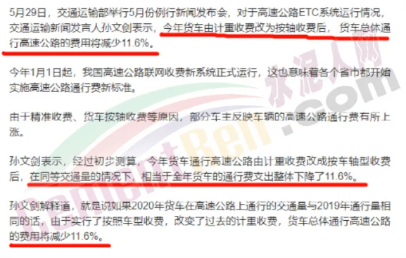 交通運輸部新聞發(fā)言人孫文劍表示,經(jīng)過初步測算,今年貨車通行高速公路由計重收費改成按車軸型收費后,在同等交通量的情況下,相當(dāng)于全年貨車的通行費支出整體下降了11.6%。