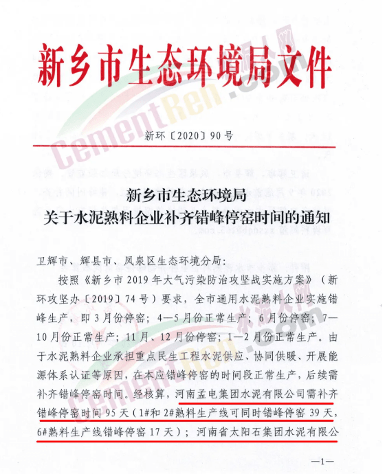 并請衛(wèi)輝市、輝縣市、鳳泉區(qū)生態(tài)環(huán)境分局加強監(jiān)管,確保2020年9月底前水泥熟料企業(yè)錯峰停窯到位,錯峰時間補齊。通知原文如下:
