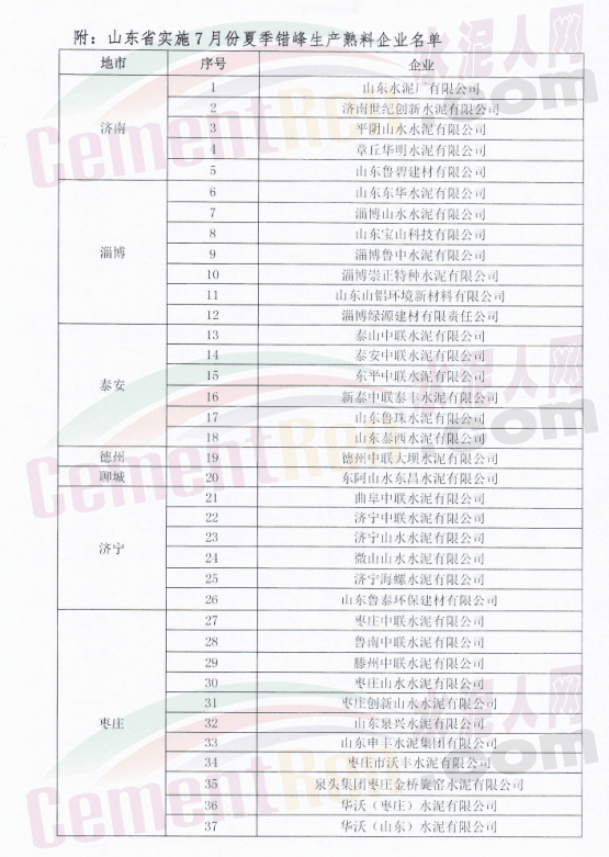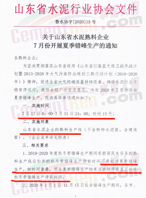據(jù)水泥人網(wǎng)消息,近日,山東省水泥行業(yè)協(xié)會(huì)發(fā)布《關(guān)于山東省水泥熟料企業(yè)7月份開(kāi)展夏季錯(cuò)峰生產(chǎn)的通知》稱(chēng):為堅(jiān)決貫徹落實(shí)山東省政府《山東省打瀛藍(lán)天保衛(wèi)戰(zhàn)作戰(zhàn)計(jì)劃暨2013-2020年大氣污染防治規(guī)劃三期行動(dòng)計(jì)劃(201-2020年)》精神,促進(jìn)全省大氣環(huán)境質(zhì)量持續(xù)改善,確保水泥行業(yè)平穩(wěn)有序運(yùn)行,山東省水泥協(xié)會(huì)決定2020年7月份實(shí)施夏季錯(cuò)峰生產(chǎn),具體通知如下: