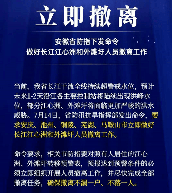 安徽省防汛抗旱指揮部發(fā)出命令,要求安慶、池州、銅陵、蕪湖、馬鞍山市立即做好長(zhǎng)江江心洲和外灘圩人員撤離工作,確保撤離不漏一戶、不落一人。