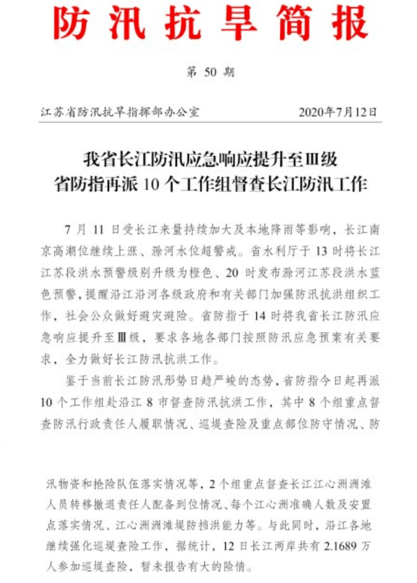 江蘇省防汛抗旱指揮部辦公室發(fā)布關(guān)于檢查長(zhǎng)江江心州灘人員轉(zhuǎn)移撤退預(yù)案落實(shí)情況的通知稱,根據(jù)江心洲人員撤退預(yù)案,為切實(shí)做好江心洲人員轉(zhuǎn)移撤退準(zhǔn)備工作,省水利廳將派工作組進(jìn)駐檢查江心洲人員撤退方案落實(shí)情況。