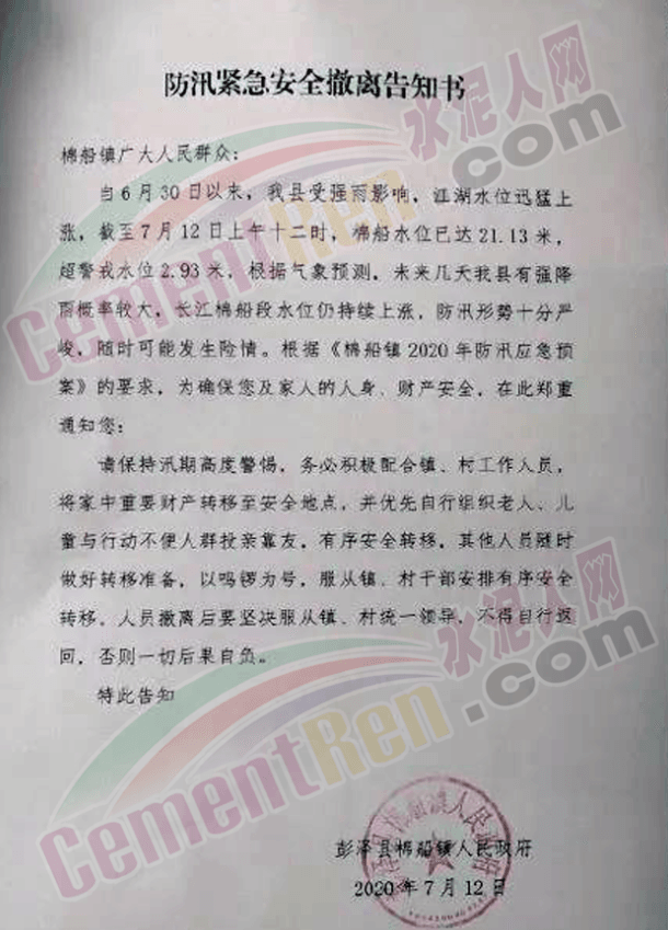 彭澤縣棉船鎮(zhèn)發(fā)布告知書(shū),要求當(dāng)?shù)厝罕姼叨染?,積極配合將家中重要財(cái)產(chǎn)轉(zhuǎn)移至安全地點(diǎn),優(yōu)先組織老人、兒童與行動(dòng)不便人群有序安全轉(zhuǎn)移,其他人員隨時(shí)做好轉(zhuǎn)移準(zhǔn)備,人員撤離后要堅(jiān)決服從領(lǐng)導(dǎo),不得自行返回。