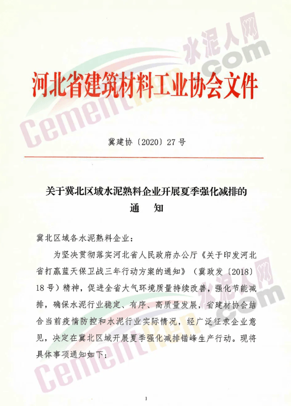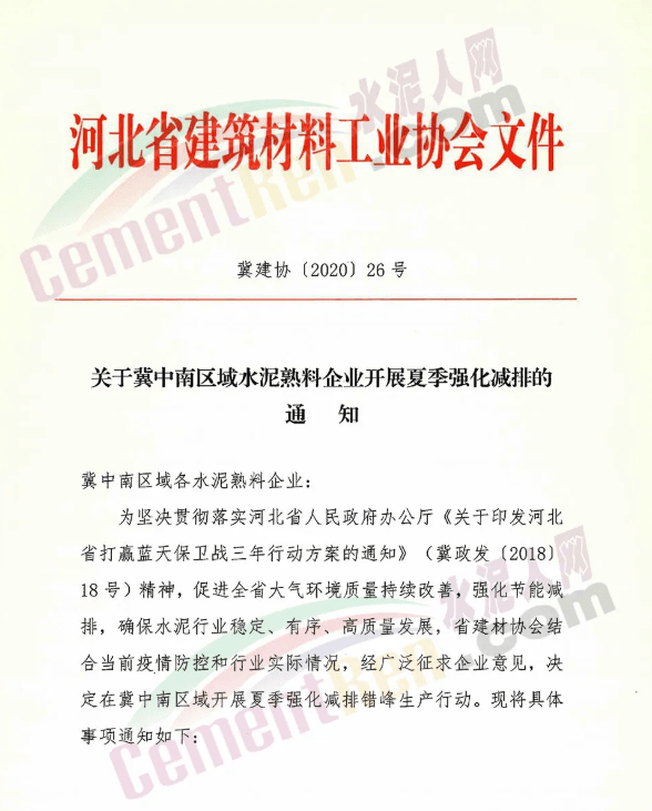 邯鄲、邢臺(tái)、石家莊、保定四市水泥熟料企業(yè)從2020年7月20日0時(shí)至7月29日24時(shí),共停10天。其中,河北金隅鼎鑫水泥有限公司和河北曲寨礦峰水泥股份有限公司已于2020年7月10日0時(shí)至7月19日24時(shí),提前執(zhí)行錯(cuò)峰生產(chǎn),共計(jì)10天;根據(jù)邢臺(tái)區(qū)域強(qiáng)化減排實(shí)際情況,區(qū)域內(nèi)水泥熟料企業(yè)按地方政府要求執(zhí)行錯(cuò)峰停窯,停窯天數(shù)計(jì)入本次錯(cuò)峰生產(chǎn)考核績效。原文件如下: