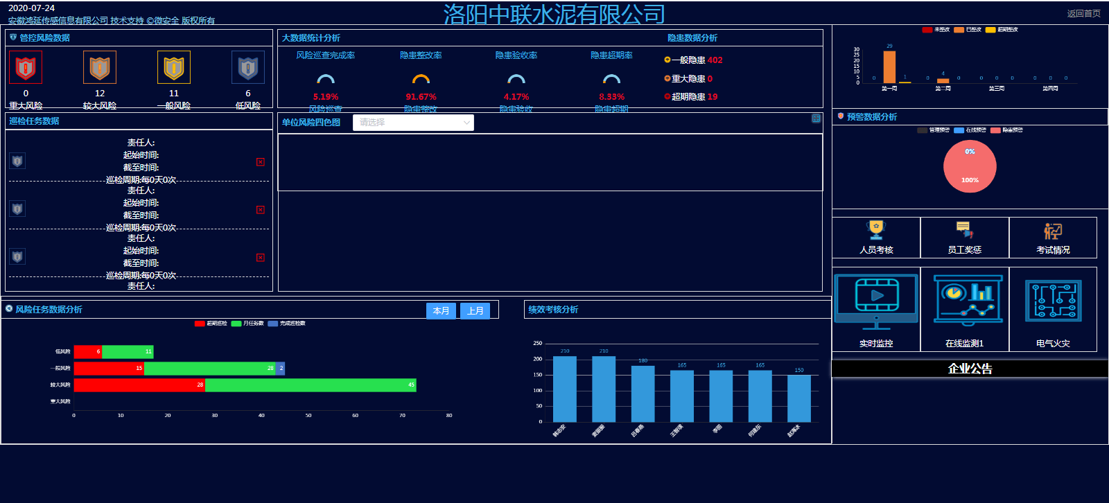 洛陽中聯(lián)自建廠以來,高度重視安全工作,先后投入大量的資金和人力,不斷完善公司的安全生產(chǎn)管理體系。2018年7月份以來,隨著《河南省安全生產(chǎn)監(jiān)督管理局關(guān)于開展我省工貿(mào)行業(yè)企業(yè)安全風險評估診斷分級的通知》和《河南省企業(yè)風險分級管控隱患排查治理雙重預防指導手冊》兩份文件的先后下發(fā),洛陽中聯(lián)積極響應上級指示精神,開始于2019年3月份,依托公司的智能化平臺,正式著手構(gòu)建洛陽中聯(lián)信息化雙重預防機制。