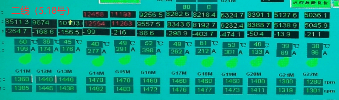 該公司二線篦冷機(jī)改造配套風(fēng)機(jī)為國(guó)內(nèi)某傳統(tǒng)廠家篦冷風(fēng)機(jī),項(xiàng)目于2019年竣工。2020年5月18日,一線熟料日產(chǎn)量6400t左右,二線熟料日產(chǎn)量6300t左右,對(duì)比兩條線篦冷風(fēng)機(jī)中控顯示運(yùn)行電流如下: