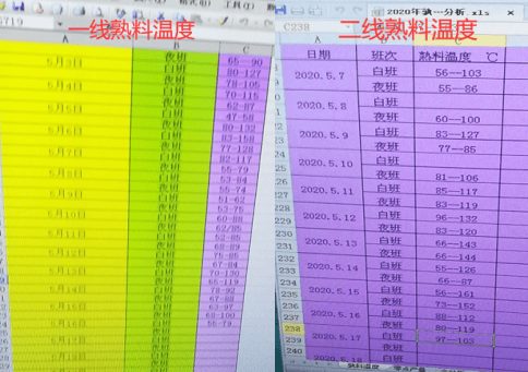 除了對(duì)比兩條線風(fēng)機(jī)運(yùn)行能耗,工程技術(shù)人員還對(duì)比了5月份兩條線正常運(yùn)行后在相同位置測(cè)得的熟料溫度,一線熟料溫度大約50-90℃,二線熟料溫度大約60-120℃,一線熟料溫度明顯低于二線孰料溫度,可見一線冷卻效果好于二線,見下圖。